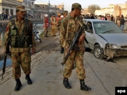 Pakistani soldiers inspect the scene of a bombing in Peshawar. Have 10 years of violence been for naught?