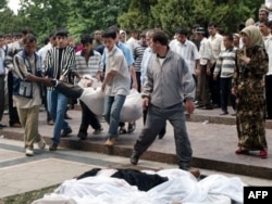 Local residents carry the body of a victim killed in a brutal crackdown by government forces on protesters in the Uzbek town of Andijon in 2005.