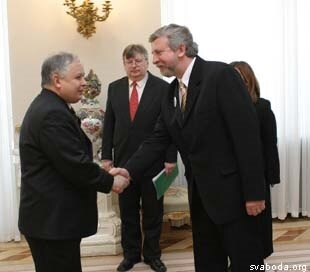 Belarusian united opposition candidate Alyaksandr Milinkevich met with Polish President Lech Kaczynski in Warsaw on January 25 (RFE/RL)
