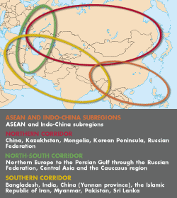 UNESCAP calls existing rail links within the South Caucasus (Armenia, Azerbaijan, and Georgia) and Central Asia (Kazakhstan, Kyrgyzstan, Tajikistan, Turkmenistan, and Uzbekistan) "railways of international importance."