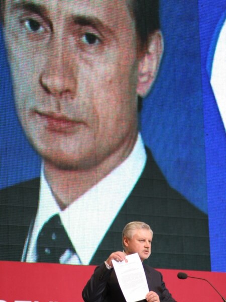 St. Petersburg native and Federation Council Chairman Sergei Mironov in front of a poster of Putin at a political conference in Petersburg last month (TASS)