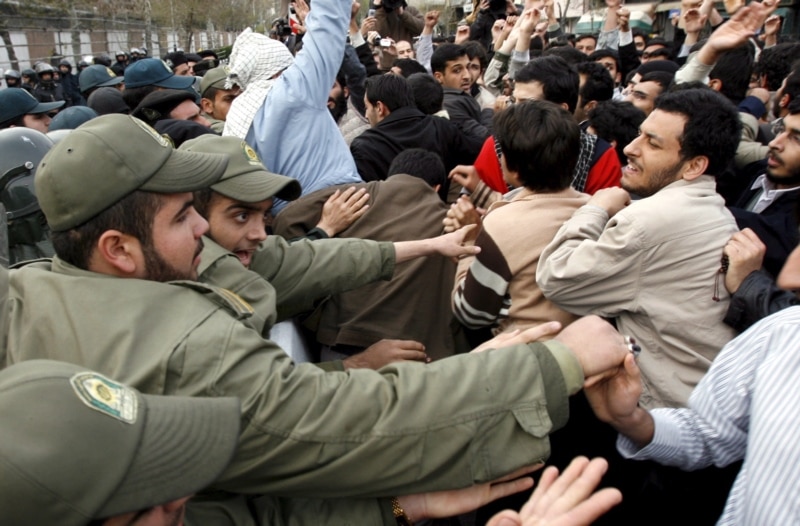 Iranian police battle with student Basij protestors in front of the British Embassy in Tehran today (epa)