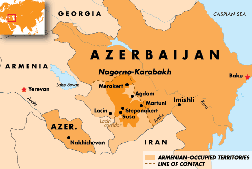 In February 1988, the local assembly in Stepanakert, the local capital of the Azerbaijani region of NAGORNO-KARABAKH, passed a resolution calling for unification of the predominantly ethnic-Armenian region with Armenia. There were reports of violence against local Azeris, followed by attacks against Armenians in the Azerbaijani city of Sumgait. In 1991-92, Azerbaijani forces launched an offensive against separatist forces in Nagorno-Karabakh, but the Armenians counterattacked and by 1993-94 had seized almost all of the region, as well as vast areas around it. About 600,000 Azeris were displaced and as many as 25,000 people were killed before a Russian-brokered cease-fire was imposed in May 1994.