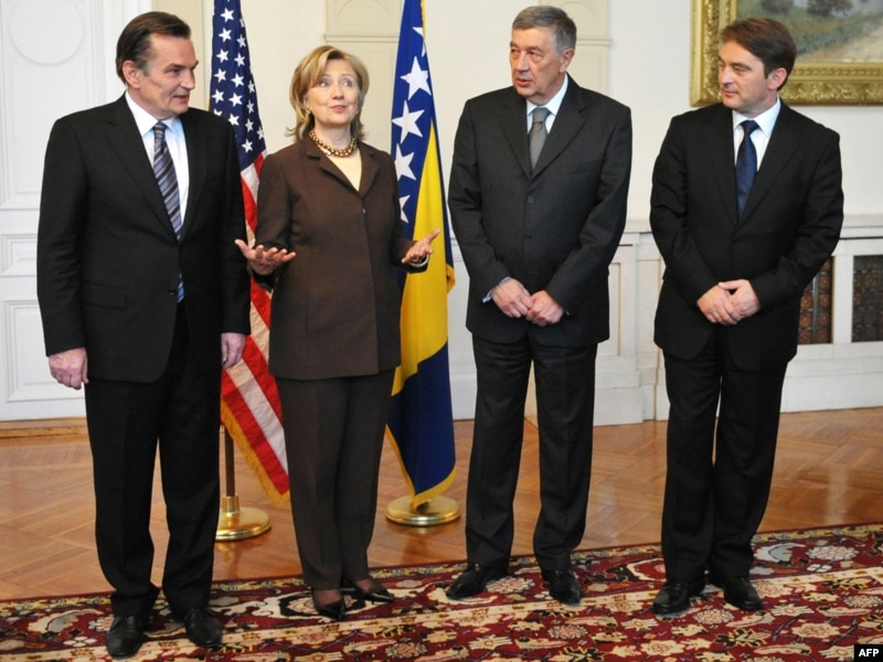 Bosnian Presidency Chairman Haris Silajdzic and Presidency Members Nebojsa Radmanovic and Zeljko Komsic (left to right) with U.S. Secretary of State Hillary Clinton in Sarajevo on October 12