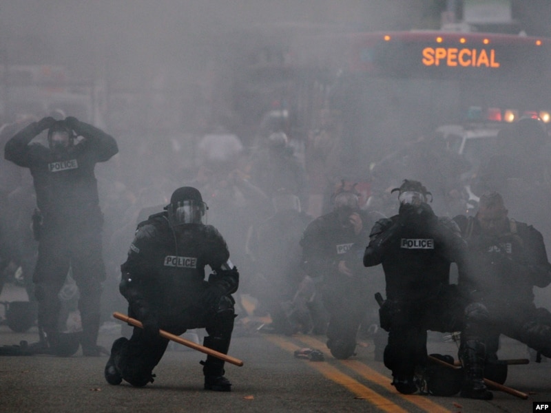 As evening fell, a group of a few hundred protesters tried to make their way inside the security perimeter and were met by police in riot gear and on horseback. Canisters of tear gas were dropped and nonlethal concussion grenades were lobbed. Sound cannons that emitted high-pitched noises caused many of the marchers to retreat.