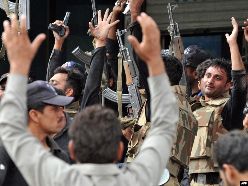 Pakistani police raise their guns in celebration after taking control of one of two mosques stormed by gunmen in Lahore in May.