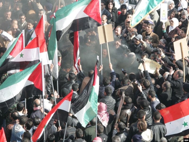 Syrians protest Israel's Gaza ground offensive in Damascus on January 5.