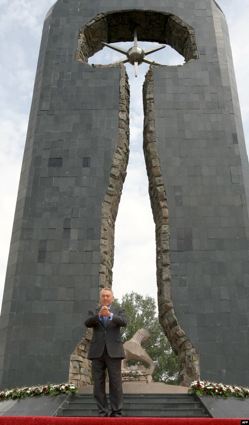 Kazakh President Nursultan Nazarbaev stands in front of a monument to the nuclear tests in Semipalatinsk in June.