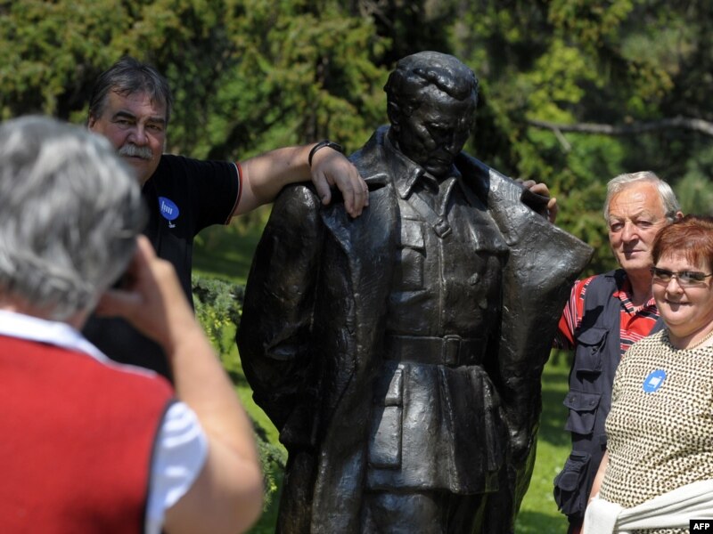 A group of Slovenian tourists take photos beside a bust of Tito in Belgrade.