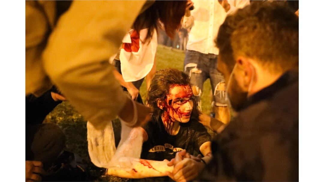 A wounded protester is tended to while awaiting an ambulance.