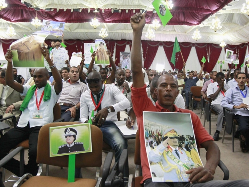 Pro-Qaddafi Libyans chant slogans during a conference of Libyan tribes in a tent in Tripoli on July 14.