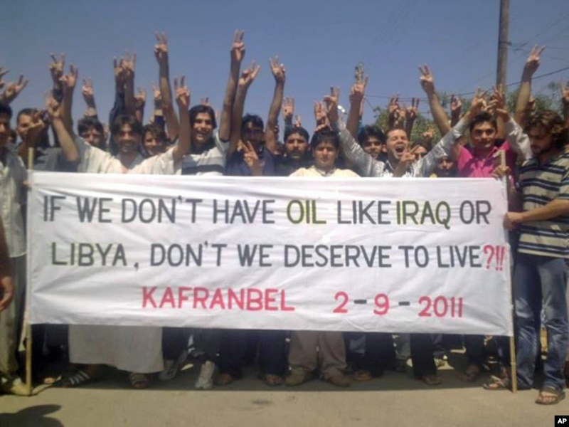 Antiregime protesters hold a banner during a demonstration in Syria's Edlib Province on September 2.