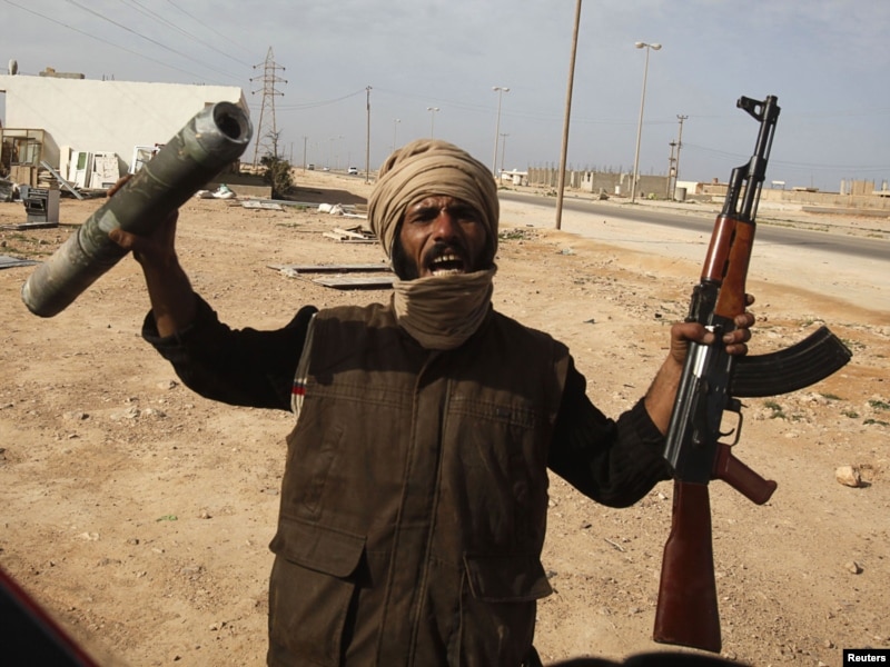 A protester in Tobruk shows a mortar shell used by troops loyal to one of Qaddafi's sons to destoy a munitions store.