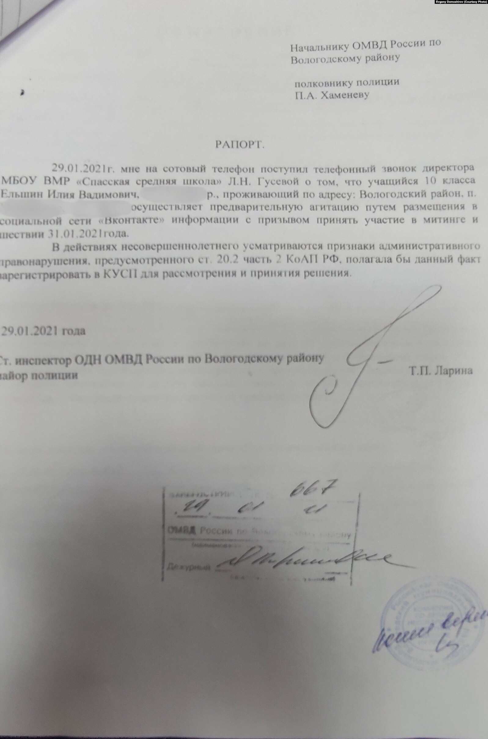 VOLOGDA, Russia -- Savely Narizhny is a 15-year-old former high school student in the northwestern Russian city of Vologda. On the evening of January 23, he was stopped in the center of the city after attending an unsanctioned mass demonstration in support of opposition leader Aleksei Navalny, who at the time was jailed and facing serious criminal charges. Narizhny wasn't detained, but police confiscated his telephone. Three days later, police came for him at home.