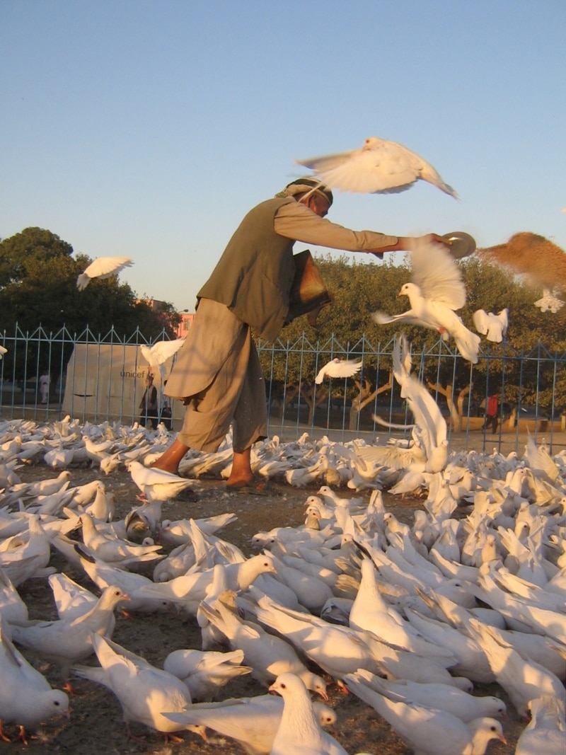 To one side of the mosque complex is the pigeon house. It is a large, low concrete box with small windows and most of its space below ground. This is where the doves nest and breed year-round. It is also where they are fed.