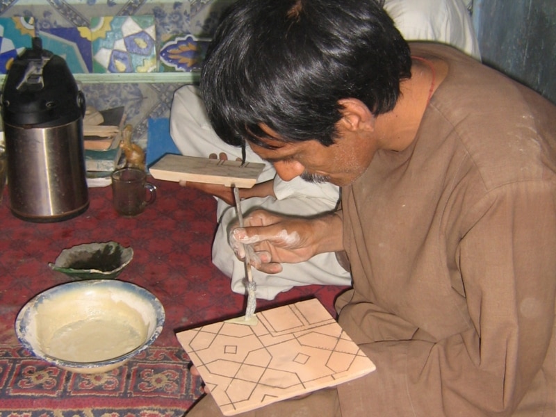 Where do these beautiful tiles come from? The men who make the tiles have a small workshop just outside the mosque complex. They are surprised to receive visitors but ready to offer tea and answer questions.