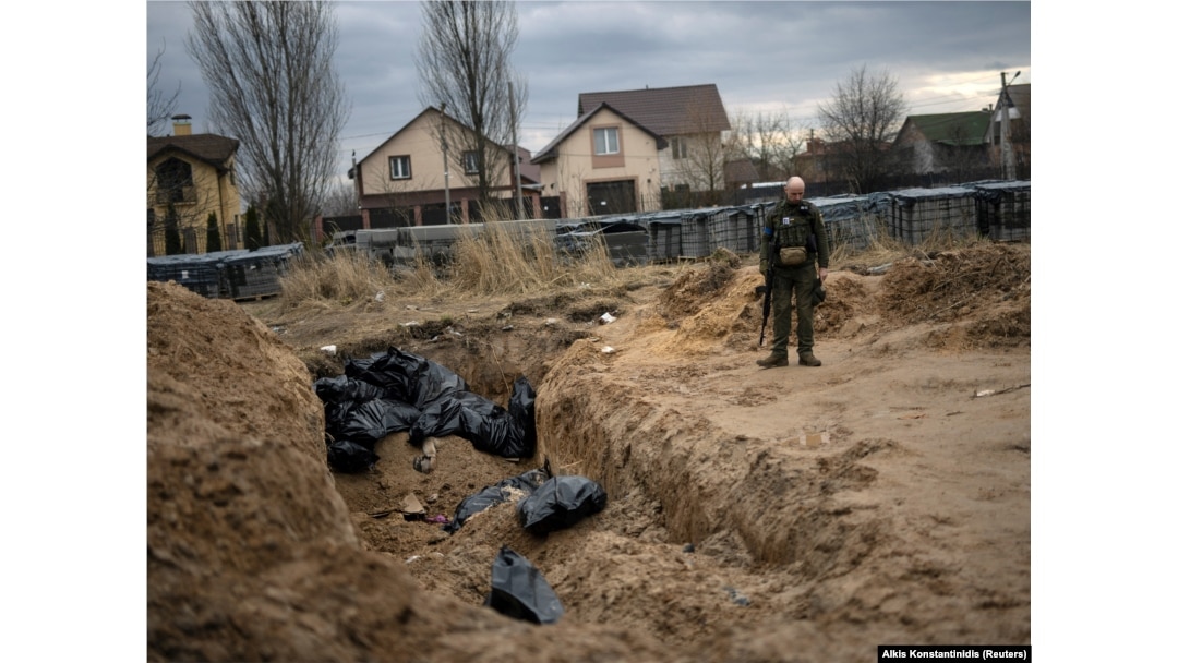 An April 6 photo shows a Ukrainian soldier next to a mass grave of civilians killed during the Russian occupation of Bucha.