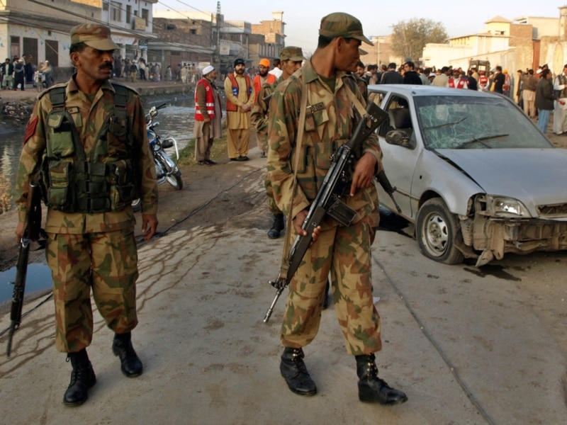 Pakistani soldiers inspect the scene of a bombing in Peshawar. Have 10 years of violence been for naught?
