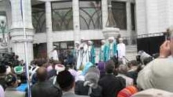 Religious and political leaders from the entire Islamic world were in attendance. Delegates from Central Asia, Azerbaijan, Russia, Saudi Arabia, Kuwait, Iran, Turkey, Egypt, the United Arab Emirates, and even Belarus, joined thousands of believers to perform their Friday prayers after the muezzin's azan, or first call. (Listen to the opening call to prayer. Real Audio, Windows Media)