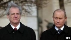 Hungarian President Laszlo Solyom (left) and Russian President Vladimir Putin during a welcoming ceremony for Putin today at Budapest's Alexander Palace (epa) 28 February 2006 -- Russian President Vladimir Putin today acknowledged Moscow's “moral responsibility” for the bloody Soviet suppression of the 1956 Hungarian uprising.