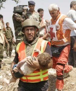 A Red Cross rescuer carries the body of child killed in the July 30 Israeli air strike in Qana (epa)