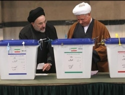 Hashemi-Rafsanjani (right) voting with fellow former President Mohammad Khatami in elections in December 2006 (MNA)