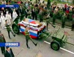 A military orchestra played a funeral march as soldiers carried Yeltsin's coffin into Moscow's Novodevichy Cemetery, followed by his family, Russian Orthodox priests, Russian political and cultural elite, and dignitaries from across the world.