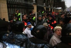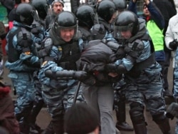 Minutes later, United Civic Front leader Garry Kasparov, Limonov, and For Human Rights leader Lev Ponomarev catch up with the crowd near the Turgrnevskaya metro station. Organizers of the formal rally on Sakharov Prospect appear intent on carrying a Dissenters' resolution to the Central Election Commission. But the group is immediately set upon by OMON forces and plainclothed special-services officers. Ponomarev is detained and allegedly beaten.